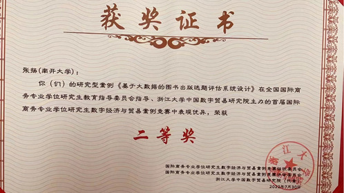 张扬提交的研究型案例“基于大数据的图书出版选题评估系统设计”是天津市重点研发计划科技支撑重点项目“基于文化大数据的内容出版聚合服务平台研发”的组成部分,该项目由太阳成集团tyc4633、太阳成集团tyc4633软件学院及天津人民出版社合作承担。此次获奖是我校国际商务(MIB)研究型案例首次参赛。据大赛评委、张扬的导师楚义芳副教授介绍,由于首届国际商务专业学位研究生数字经济与贸易案例竞赛并未对参赛人资格做出限制,许多学校是由老师提交案例参赛的,所以实际上,首届国际商务专业学位研究生数字经济与贸易案例竞赛是师生同台竞技。因此,在如林的强手中,张扬同学申报的案例能够获得二等奖,实属难能可贵。