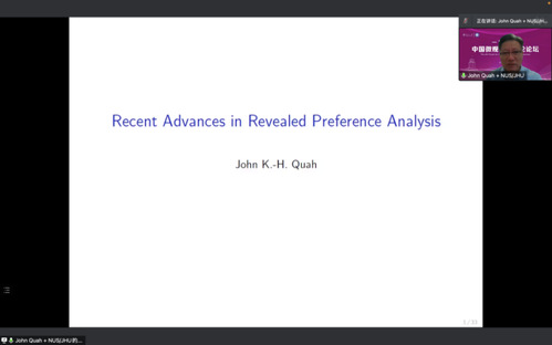 黄群慧作了题为《探索中国式现代化的微观经济机制》的主旨演讲,他指出,习近平经济思想是中国式现代化的经济理论指南,我们的研究需要围绕其进一步的展开,以中国式现代化实现中华民族伟大复兴。在社会主义现代化建设新征程中,微观经济学的重要性是毋庸置疑的,要加强微观经济学基础研究,把微观层面市场主体的作用发挥好,是实现经济高质量发展的基础。John Quah(柯金浩)教授作了题为Recent advances in Revealed Preference Analysis的主旨演讲,他首先从基础的Afriat定理开始介绍了显示性偏好理论,详细介绍了关于该理论的文献回顾,把理性个体与显示性偏好强公理相联系,并且介绍了该公理的一些扩展和修正等前沿性的研究。王永进教授作了题为《数字经济对国际贸易理论的挑战:以引力方程为例》的主旨演讲,他表示,数字经济不仅仅在推动全球贸易分工的深度调整,而且也使得国际贸易理论和现实之间的鸿沟在不断的扩大。因此,数字经济对于贸易理论来说是一个很大的机遇,并非意味着贸易理论会走向终结。