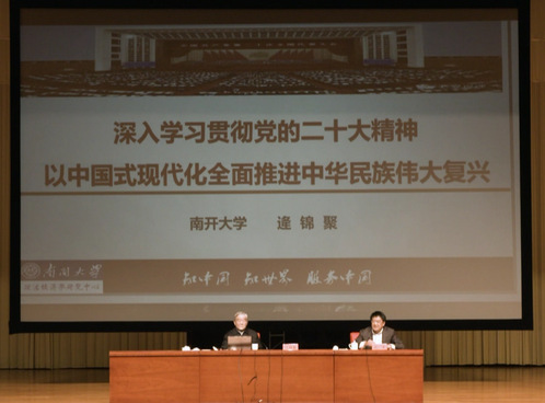 逄锦聚教授以“深入学习贯彻党的二十大精神 以中国式现代化全面推进中华民族伟大复兴”为题作辅导,围绕“中国化时代化马克思主义关于现代化理论的新飞跃”“深刻理解全面把握中国式现代化的中国特色和本质要求”“以中国式现代化全面推进中华民族伟大复兴”三部分展开阐述。