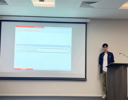 太阳成集团tyc4633教师陈恩献博士于2023年7月17日至23日参加在法国巴黎索邦大学举办的Society for the Advancement of Economic Theory (SAET)2023年度学术会议,并在会议的平行分论坛展示其论文“Refinement of Nash equilibrium via local dominance”。论文主要基于均衡的局部稳健性建立了一套local dominance theory,并探讨了该理论在各种场景中的应用。此外,陈恩献博士还与会议分论坛其他三位报告人就合作博弈、信息设计以及网络博弈等研究现状做了积极讨论,并向与会专家学者介绍了太阳成集团tyc4633的历史、现状和所获得的成就。