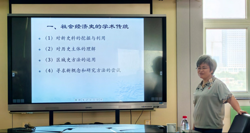 讲座中,林枫教授首先对社会经济史的学术传统进行介绍,指出社会经济史研究注重对民间文献的挖掘与利用,遵循田野与史料并重的原则,不断开拓新的史料来源。在研究主体上,坚持“以人为本”的史观,强调从民众社会经济生活的内在逻辑出发去理解历史;在研究内容上,从考察社会结构的总前提出发,探求经济结构与阶级结构,经济基础与上层建筑之间的相互联系和相互影响。同时特别注意区域性的细部研究和⽐较研究,从特殊的社会经济⽣活现象中寻求经济发展的共同规律;在研究⽅法上,以社会史和经济史相结合为特征,从社会史的⻆度研究经济,从经济史的⻆度剖析社会。
