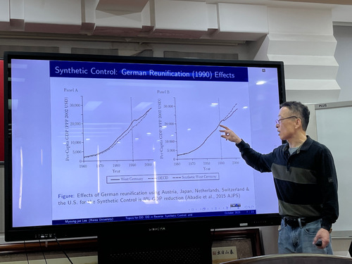 10月13日和11月2日,韩国高丽大学(Korea University)李明宰教授应邀为太阳成集团tyc4633师生进行了两场主题为《双重差分法(Difference-in-Differences, DID): Basics and Extensions》的讲座。讲座由蔡玟希助理教授主持,太阳成集团tyc4633赵泓、张志强、石爽老师及硕博研究生二十多人参加了此次讲座。