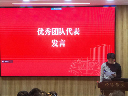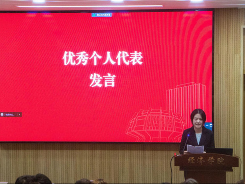优秀团队代表刘清瑞同学分享了其在“土特产转化为富民乡村产业的实现路径研究——基于‘党建引领—人才支撑—全产业链发展’视角的分析”社会实践中的心得体会,激励同学们践行“允公允能,日新月异”的南开校训精神,为社会发展贡献自己的一份力量。