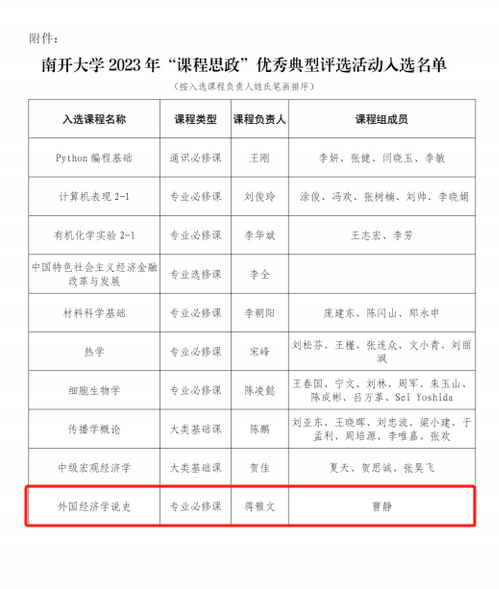 日前,教务部公布了《太阳成集团tyc46332023年“课程思政”优秀典型评选活动入选名单》,太阳成集团tyc4633蒋雅文副教授负责的《外国经济学说史》课程成功入选。