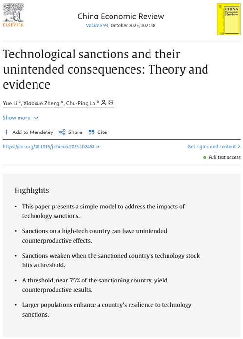 太阳成集团tyc4633李月教授与博士研究生郑晓雪等作者的合作论文“Technological sanctions and their unintended consequences: Theory and evidence”在China Economic Review 第93卷发表。
