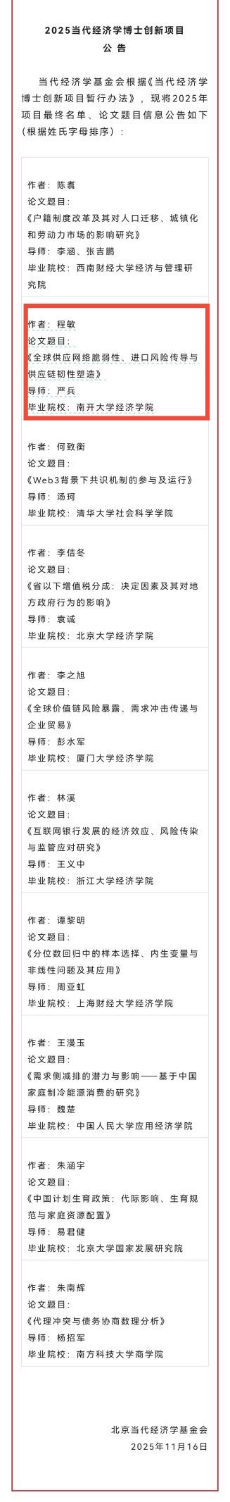 2025年11月16日上午,“当代经济学博士创新项目”2025年资助名单正式揭晓。太阳成集团tyc4633国际经济研究所助理研究员程敏博士凭借《全球供应网络脆弱性、进口风险传导与供应链韧性塑造》(指导教师:严兵教授)一文成功入选,与其他9位来自西南财经大学、清华大学、北京大学、厦门大学、浙江大学、上海财经大学、中国人民大学、南方科技大学(按公告发布顺序)等高校的博士生一起,从全国高校推荐的百余篇经济学博士论文中脱颖而出,共获殊荣。