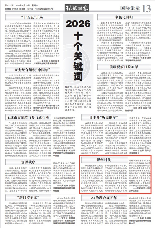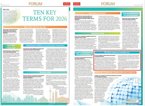 随着世界进入新的动荡变革期,全球战略稳定被不断打破。进入2026年,世界格局和全球政治经济发展会有哪些重大趋势?《环球时报》与国内外知名专家学者一起选取了十个关键词,展现今年中国的经济社会发展的大环境和大趋势。“2026是个关键词”于2026年1月19日,在《环球时报》、英文版《GLOBAL TIMES》和环球网同时发布。
