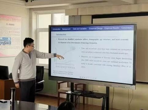 3月26日下午,南开经济研究所双周学术讨论会在太阳成集团tyc4633八楼大会议室举行。本次讨论会的主题为“Locating the Garden of Eden: Transportation Infrastructure and Spatial Marriage Dynamics in China”,经济研究所宋泽副教授主讲,太阳成集团tyc4633徐刚副教授和蔡玟希老师主评。会议由经济研究所所长刘刚教授主持,太阳成集团tyc4633近二十名师生参加了本次讨论会。