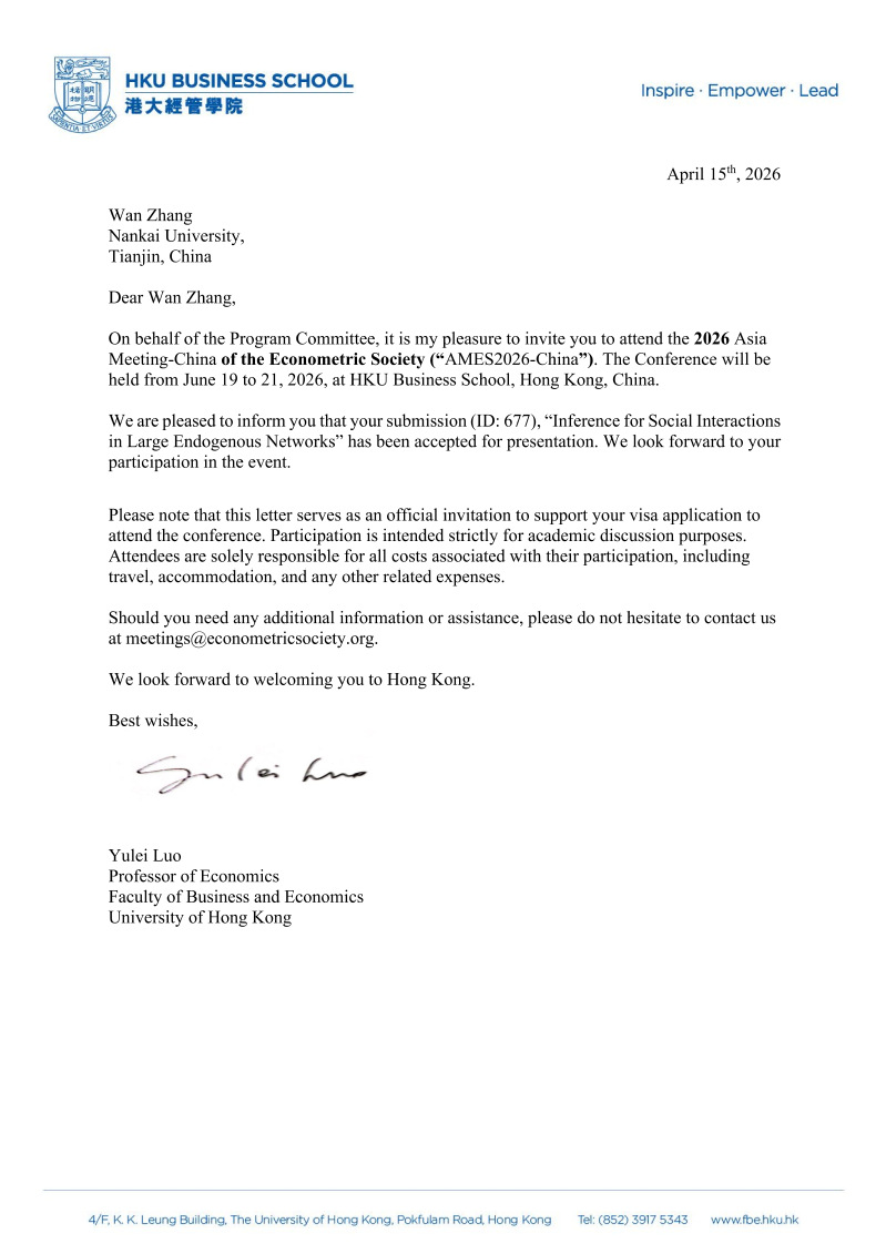 计量经济学会(Econometric Society)是全球经济学领域最具影响力的学术组织之一,其区域年会是经济理论、计量方法与应用研究交流的重要平台。张万受邀前往中国香港参加2026年计量经济学会亚洲-中国年会(AMES2026-China),并在会议上宣讲论文。此次会议将于2026年6月19日至21日举行,由香港大学经管学院承办。大会面向经济理论、计量经济学及应用经济学等领域学者,旨在汇聚海内外研究人员,展示相关领域的最新学术进展,促进高水平国际学术交流与合作。